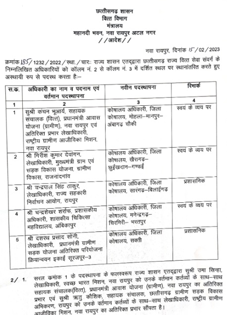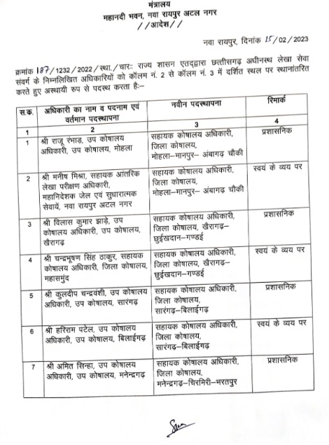 दरअसल, बुधवार को महानदी भवन, नवा रायपुर अटल नगर के वित्त विभाग से दो सूची जारी हुआ। पहले सूची 10 सहायक कोषालय अधिकारियों का नाम हैं तो वहीं दूसरे सूची में 5 कोषालय अधिकारियों का नाम हैं। इस तरह कुल 15 अधिकारीयों का ट्रान्सफर हुआ हैं। इनमें से कुछ प्रशासनिक व्यय से तो कुछ अफ़सर स्वयं के व्यय पर ट्रान्सफर हुए हैं।