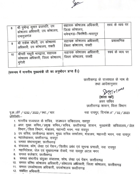 छत्तीसगढ़ राज्य सरकार ने बड़े पैमाने पर वित्त विभाग के अधिकारियों का तबादला सूची जारी किया हैं। इस संबंध में वित्त विभाग के अवर सचिव शांता खरे के द्वारा जारी ट्रान्सफर सूची में कोषालय अधिकारी और सहायक कोषालय अधिकारियों का नाम शामिल हैं।